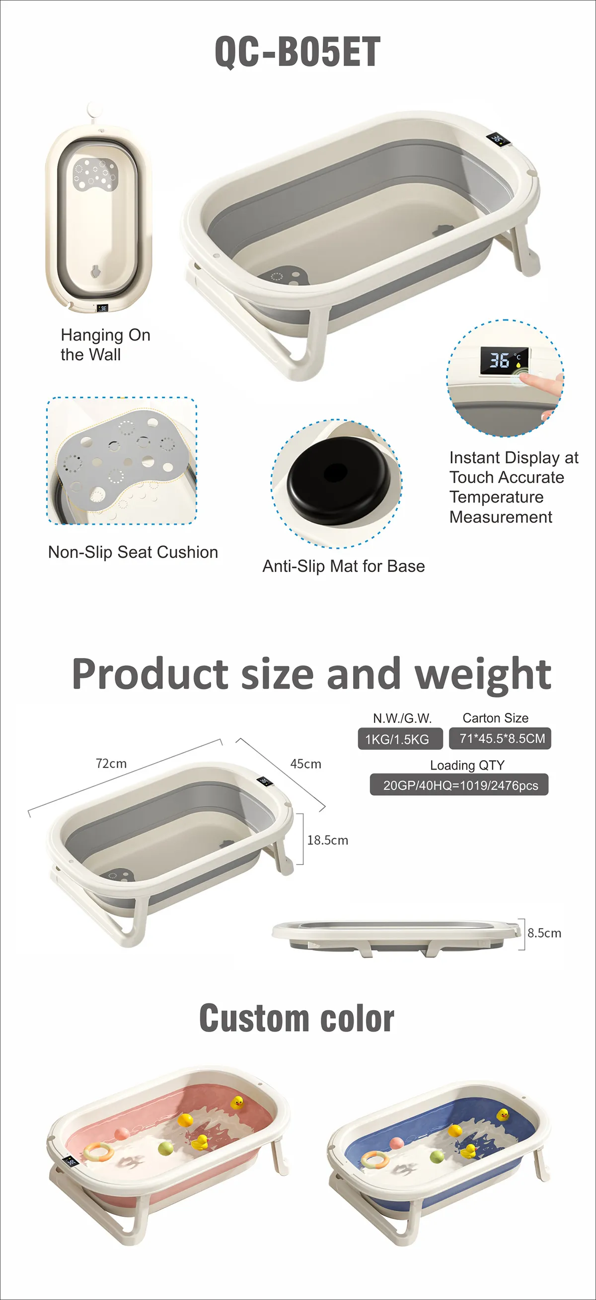 Thermostatic BathtubN.W./G.W.: 1.0 KG/1.5 KGProduct Size: 72*45*18.5 CMCarton Size: 71*45.5*8.5 CMPacking QTY: 1 PC/CTNLoading QTY: 20GP/40HQ=1020/2476 pcs